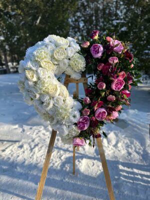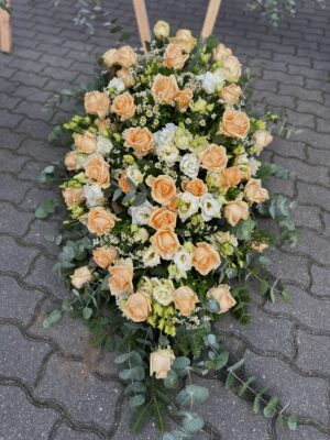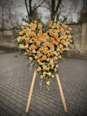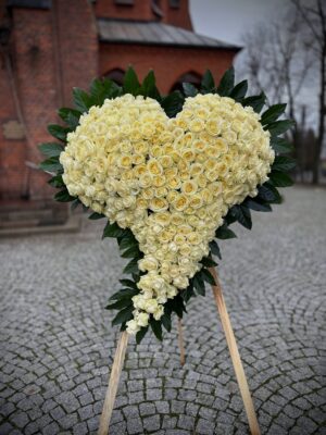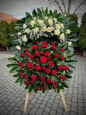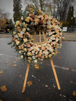 Kwiaty na pogrzeb w Warszawie w tej formie znajdują się na drewnianej (dębowej) konstrukcji z trzecią nogą. Sprawia to, że wieniec pogrzebowy stoi samodzielnie i łatwo go przenieść. Do jego tworzenia używamy liści aralii lub palmy, a także różnych kwiatów w zależności od sezonu, w którym odbywa się uroczystość. W odróżnieniu od kwiaciarni przycmentarnych zawsze korzystamy ze świeżych kwiatów, które uzyskujemy od dostawcy dzień przed ich dostarczeniem.