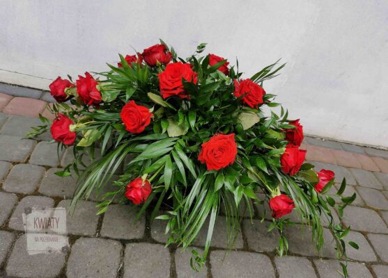 Pająk na trumnę wykonany jest z tych samych kwiatów i dodatków co wieniec. Dzięki temu mamy spójny komplet który prezentuje się okazale podczas ceremonii.