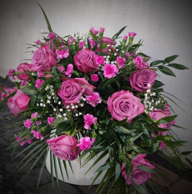 Dekoracja na trumnę została wykonana z róż oraz goździków.