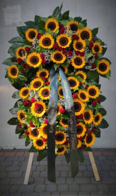 Wieniec pogrzebowy wykonany jest na florecie który zaopatruje kwiaty w wodę.