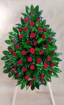 Wieniec pogrzebowy wykonany jest na florecie który zaopatruje kwiaty w wodę.