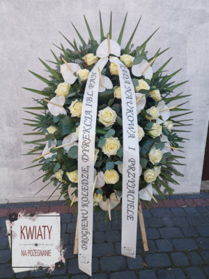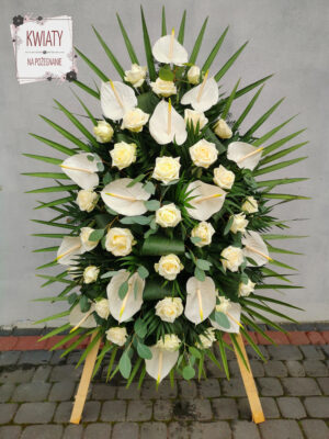 Wieniec pogrzebowy wykonany jest na florecie który zaopatruje kwiaty w wodę.