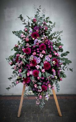 Wieniec pogrzebowy wykonany jest na florecie który zaopatruje kwiaty w wodę.