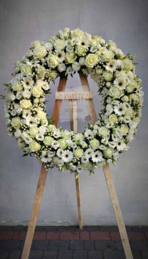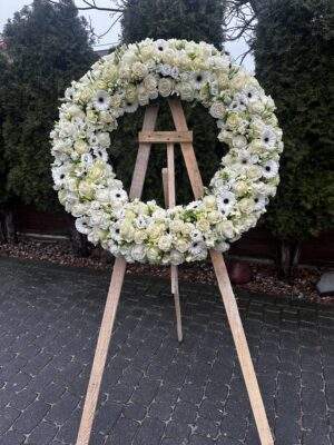 Wieniec pogrzebowy wykonany jest na florecie który zaopatruje kwiaty w wodę.