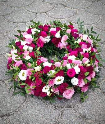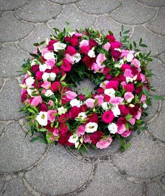 Najczęściej dopasowujemy kolorystykę wianka do kolorystyki wieńca pogrzebowego.