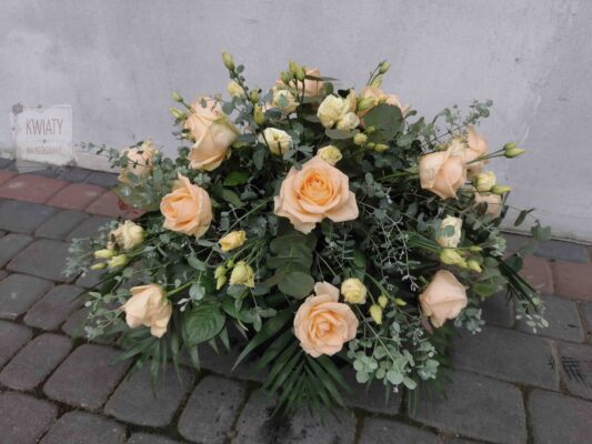 Dekoracja na trumnę została wykonana z róż oraz eustomy.