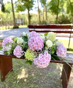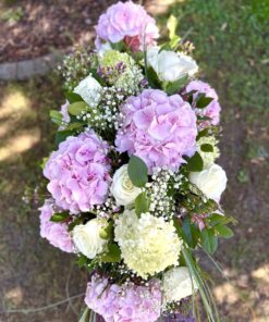 Stroik na trumnę wykonany z hortensji i róż.