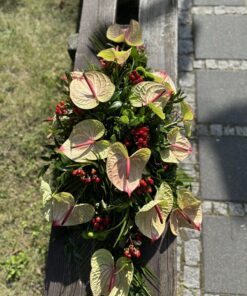 Dekoracja na trumnę została wykonana z przepięknej odmiany anthurium, santini oraz hiperikum.