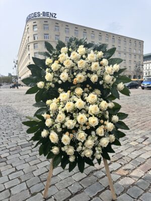 Wieniec pogrzebowy wykonany jest na florecie który zaopatruje kwiaty w wodę.