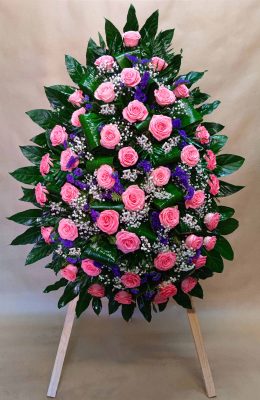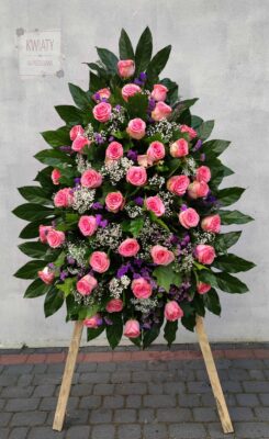 Wieniec pogrzebowy wykonany jest na florecie który zaopatruje kwiaty w wodę.