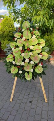 Wieniec pogrzebowy wykonany jest na florecie który zaopatruje kwiaty w wodę.