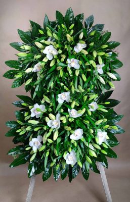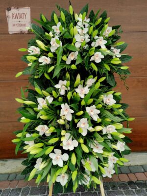 Wieniec pogrzebowy wykonany jest na florecie który zaopatruje kwiaty w wodę.