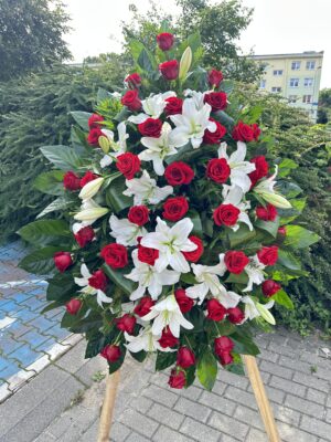 Wieniec pogrzebowy wykonany jest na florecie który zaopatruje kwiaty w wodę.