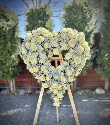 Wieniec pogrzebowy wykonany jest na florecie który zaopatruje kwiaty w wodę.