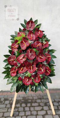 Wieniec pogrzebowy wykonany jest na florecie który zaopatruje kwiaty w wodę.