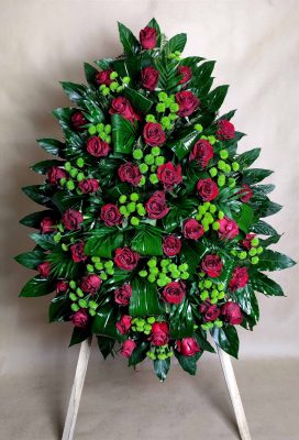 Wieniec pogrzebowy wykonany jest na florecie który zaopatruje kwiaty w wodę.