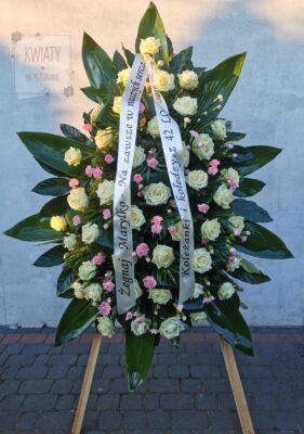 Wieniec pogrzebowy wykonany jest na florecie który zaopatruje kwiaty w wodę.