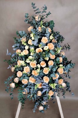 Wieniec pogrzebowy wykonany jest na florecie który zaopatruje kwiaty w wodę.