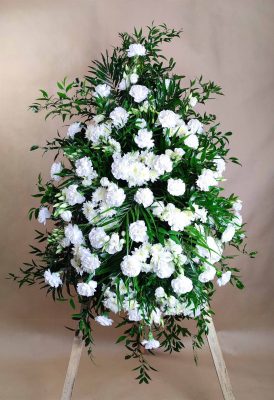 Wieniec pogrzebowy wykonany jest na florecie który zaopatruje kwiaty w wodę.