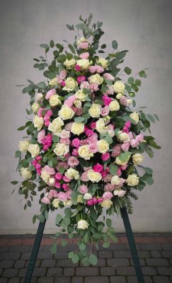 Wieniec pogrzebowy wykonany jest na florecie który zaopatruje kwiaty w wodę.