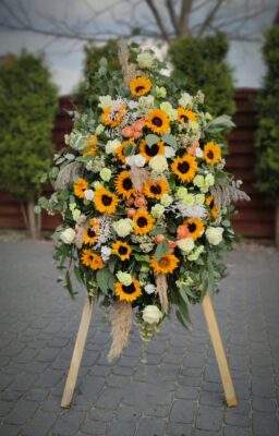 Wieniec pogrzebowy wykonany jest na florecie który zaopatruje kwiaty w wodę.