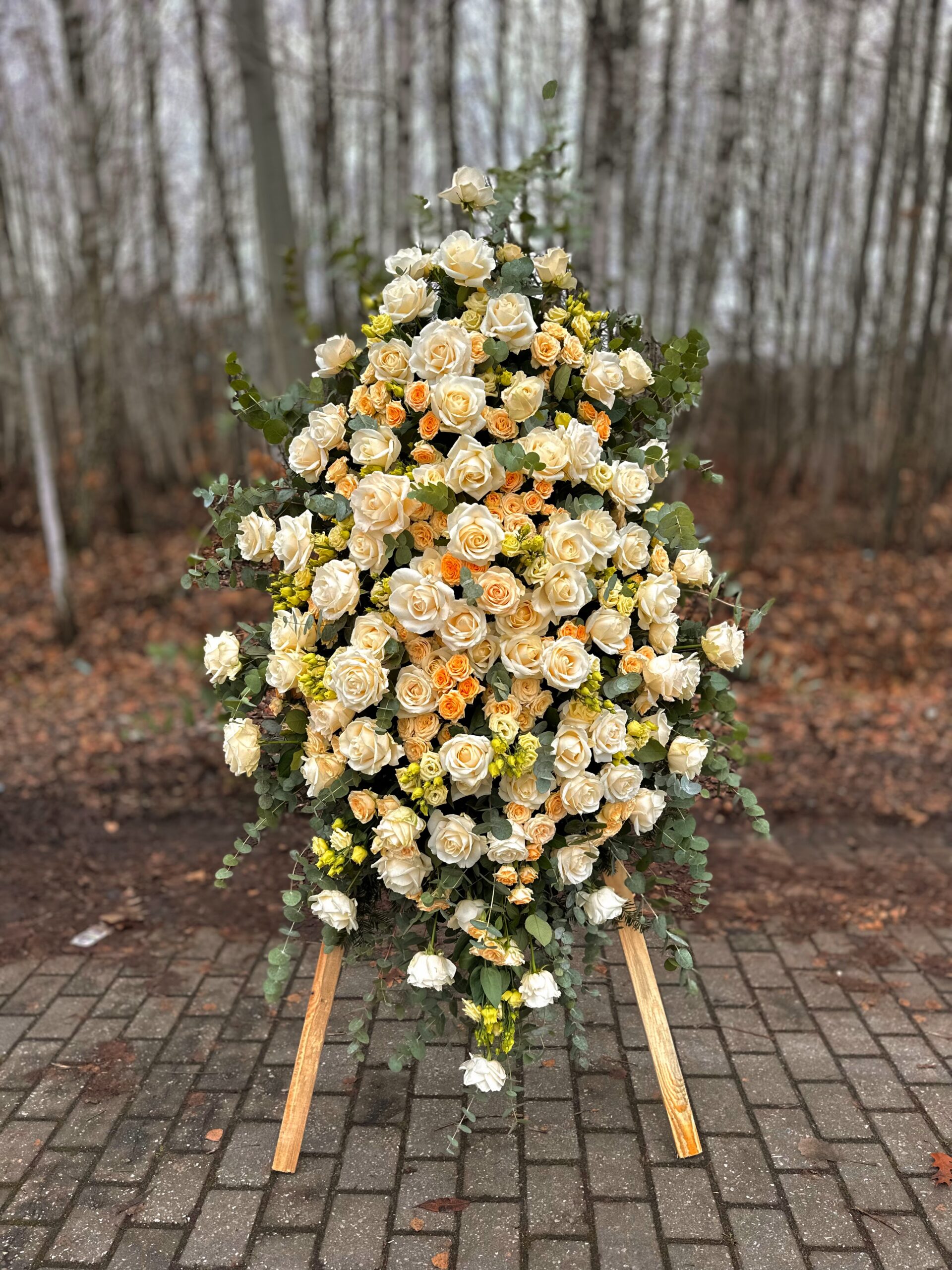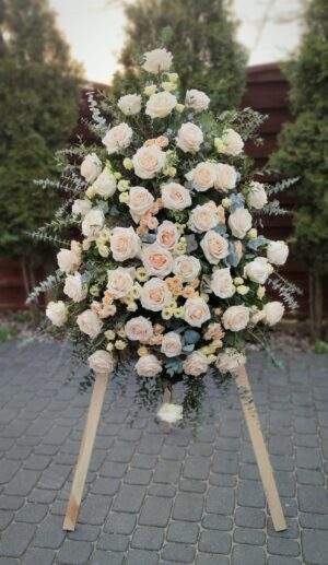 Wieniec pogrzebowy wykonany jest na florecie który zaopatruje kwiaty w wodę.