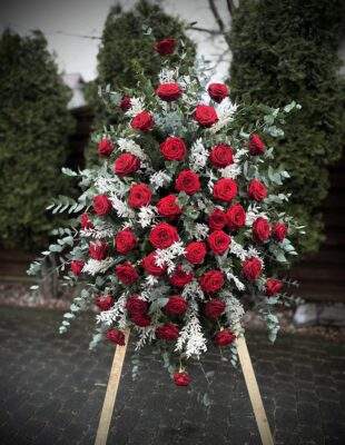 Wieniec pogrzebowy wykonany jest na florecie który zaopatruje kwiaty w wodę.