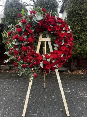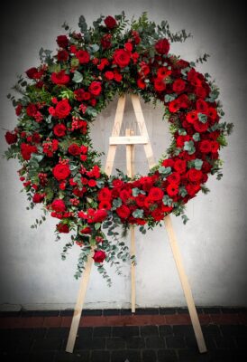 Wieniec pogrzebowy wykonany jest na florecie który zaopatruje kwiaty w wodę.