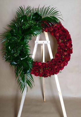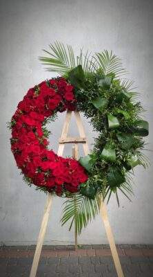 Wieniec pogrzebowy wykonany jest na florecie który zaopatruje kwiaty w wodę.