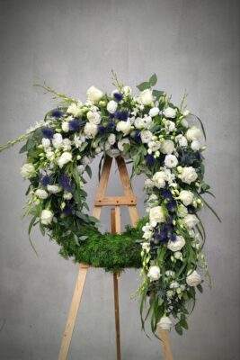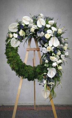 Wieniec pogrzebowy wykonany jest na florecie który zaopatruje kwiaty w wodę.