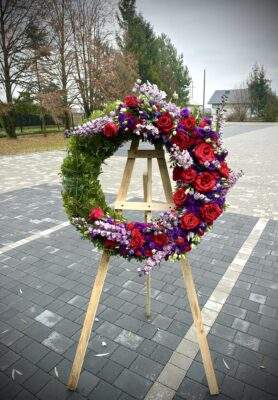 Wieniec pogrzebowy wykonany jest na florecie który zaopatruje kwiaty w wodę.
