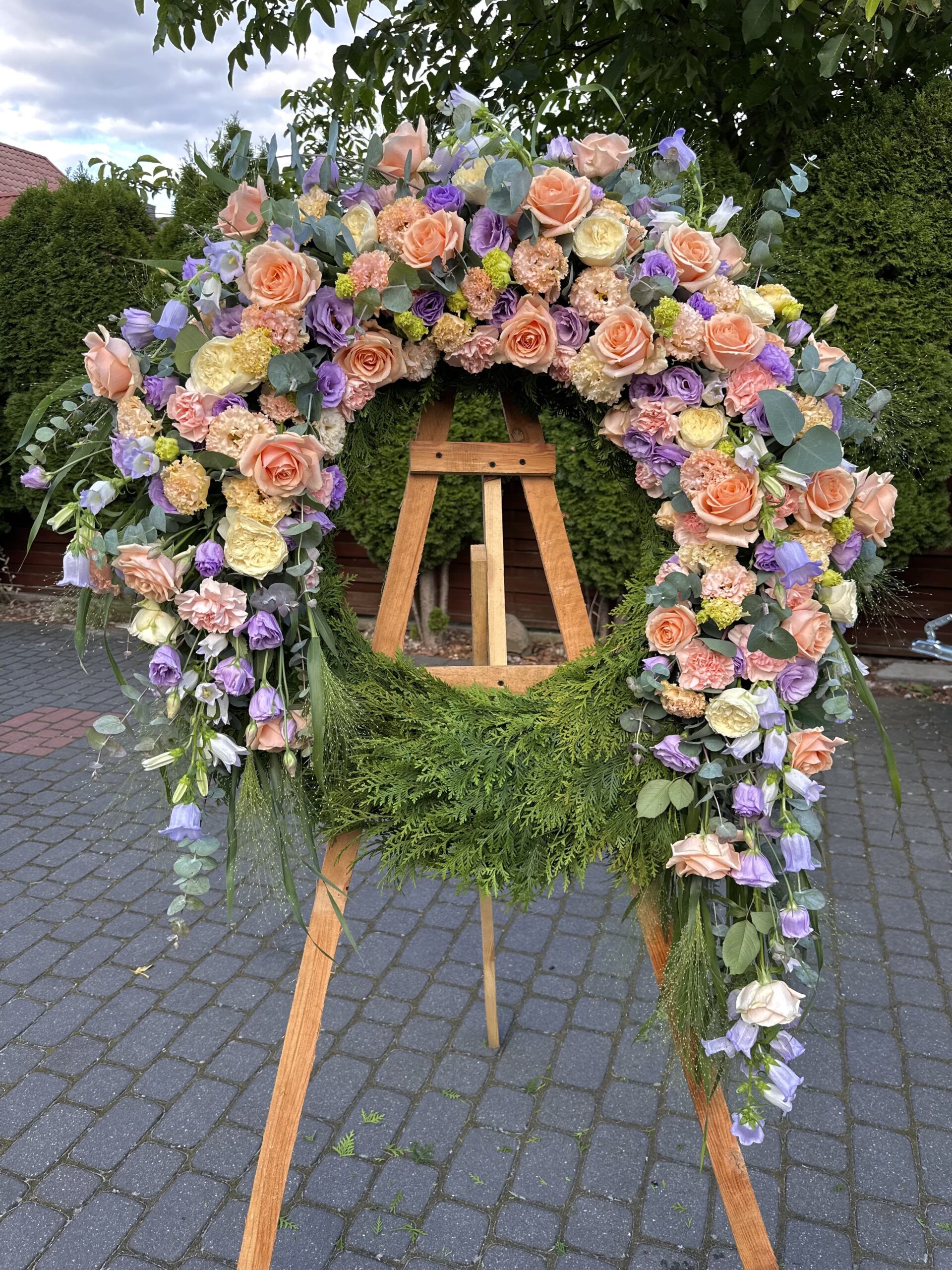 Wieniec pogrzebowy wykonany jest na stelażu który wyposażony jest w dodatkową nogę. Dzięki temu stoi samodzielnie.