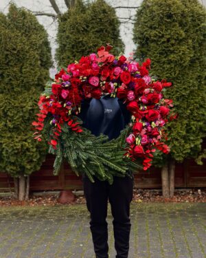Wieniec pogrzebowy wykonany jest na florecie który zaopatruje kwiaty w wodę.